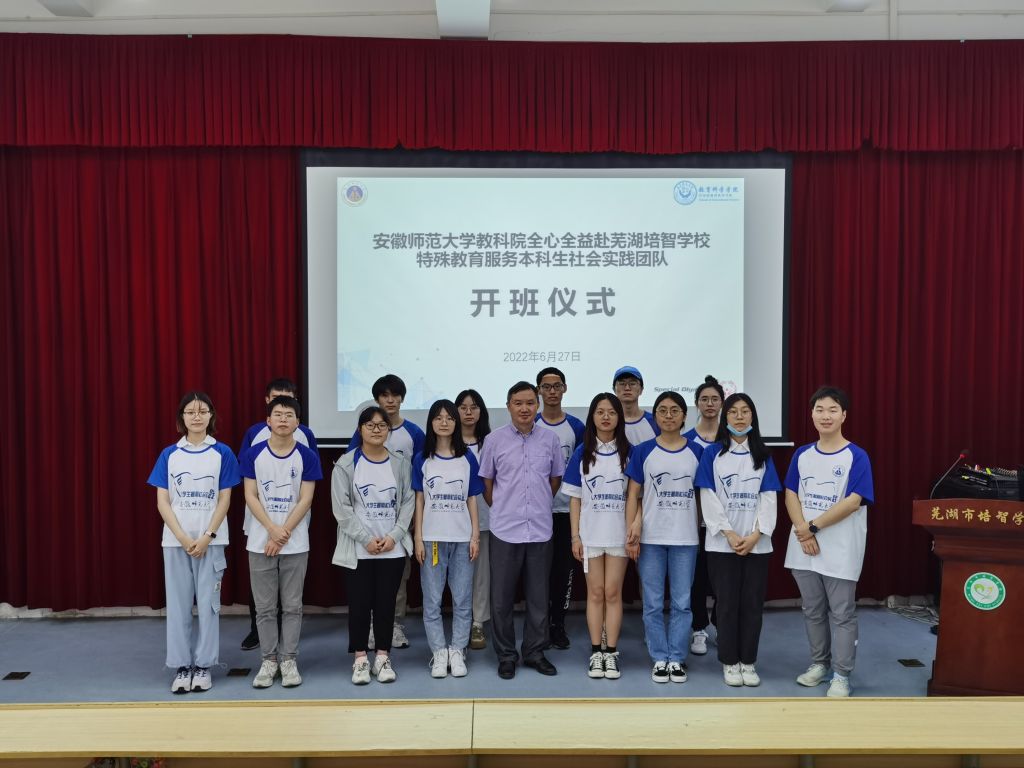 6月27日上午,实践团队在芜湖市培智学校阶梯教室举行了开班仪式。团队指导教师安徽师范大学心理咨询研究所所长方双虎,芜湖市培智学校校长徐蕾、团支部书记张康出席了开班仪式。