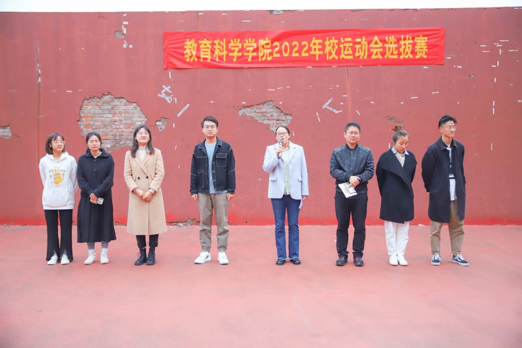 10月9日下午,校运动会选拔赛开幕式于西操场召开。院党委副书记杜凤,团委书记张理强、副书记付银行,研究生辅导员施羽晗,19级辅导员莫大贡、濮楠楠,21级辅导员赵茜,22级辅导员程雅楠与学生代表参与此次活动。由教科院五类球队代表组成的球队方阵队迈着矫健的步伐向开幕式现场走来,展现了运动员们“团结、拼搏”的精神面貌。杜凤总结了上一学年学院在丰富学生体育文化活动上的成绩与进步,指出本次院选拔赛是学院高度重视体育工作和学生身体素质的生动体现,她希望同学们积极参加各类体育活动,不断提高身体素质,发扬集体主义和勇于拼搏精神最后她预祝学院运动会选拔赛圆满完成,在校运动会上取得佳绩。