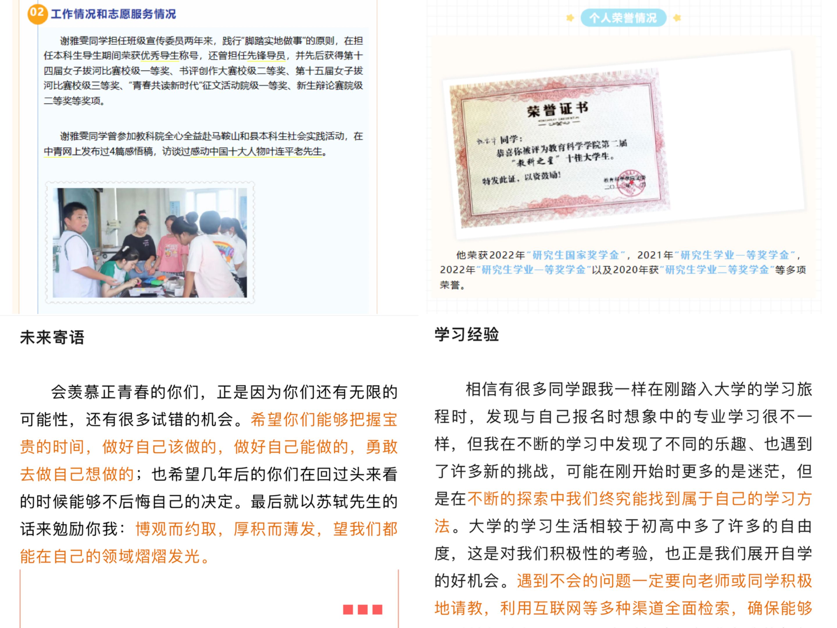 青春之我自强不息,先进个人展露风华。为发挥榜样引领作用,激发教科学子的进取精神,院团委对“教科之星”十佳大学生和保研、考研学子光荣榜进行了推文推送,并于田楼B座教科院一楼大厅展示了2023届考研光荣榜。推文具体介绍了十位“教科之星”的日常表现及获奖情况,他们德、智、体、美、劳全面发展,在道德示范与创新创业等方面各有所长;保研、考研学子成绩优异,获得多项荣誉,在推文中分享了自己的学习经验以及对学弟学妹们的未来寄语。