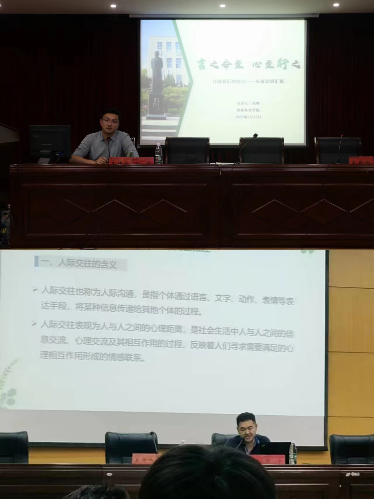 强化技能训练是提升学生综合素质的重要途径。校团委办公室主任王申振开展《二课制度与创新创业类学科竞赛》专题讲座,详细讲述了二课制度以及相关的竞赛,鼓励各位同学勇于创新,乐于挑战。校党委宣传部网宣办主任田超在《融媒体时代的新闻策划》专场讲座中以宣传思想工作的意义、融媒体时代的宣传趋势及新闻定义的再出发三个方面全方位讲解了新闻策划的过程,勉励各位同学不断提升宣传能力和媒介素养。教科院研究生辅导员程啸结合活动的策划与现场的汇报进行“台前幕后的结合”专题讲座,从学生的实际出发解决策划与汇报重难点问题。教科院心理学系副教授谢宇在“心理学在人际交往中的应用”讲座中强调把握人际交往的重要性,掌握人际交往的技巧,养成团结合作的优秀品质。培训班还举行了朋辈分享交流会,发挥朋辈力量,树立青春榜样,各位同学在持续的学习中升华思想,精进技能。