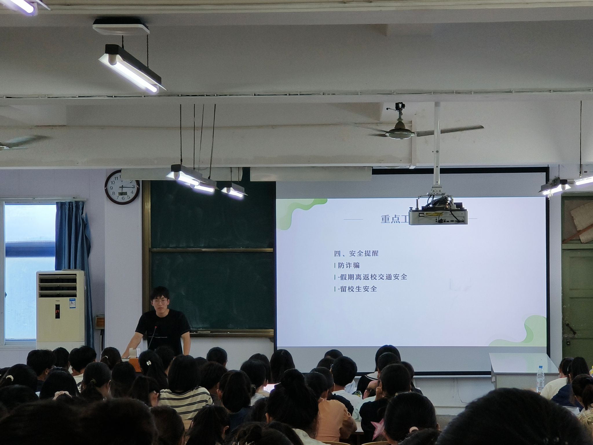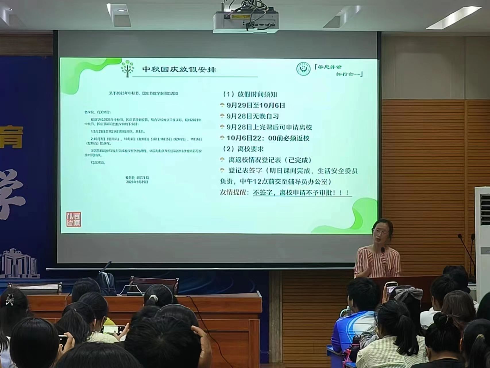 为规范国庆假期离返校程序,保证学生安全,9月27日,学院分别于实验楼401和图书馆报告厅召开2023级本科生国庆假期离校主题班会,班会由本科生辅导员金凤仙、刘玉瑾主持,全体本科生参与。
