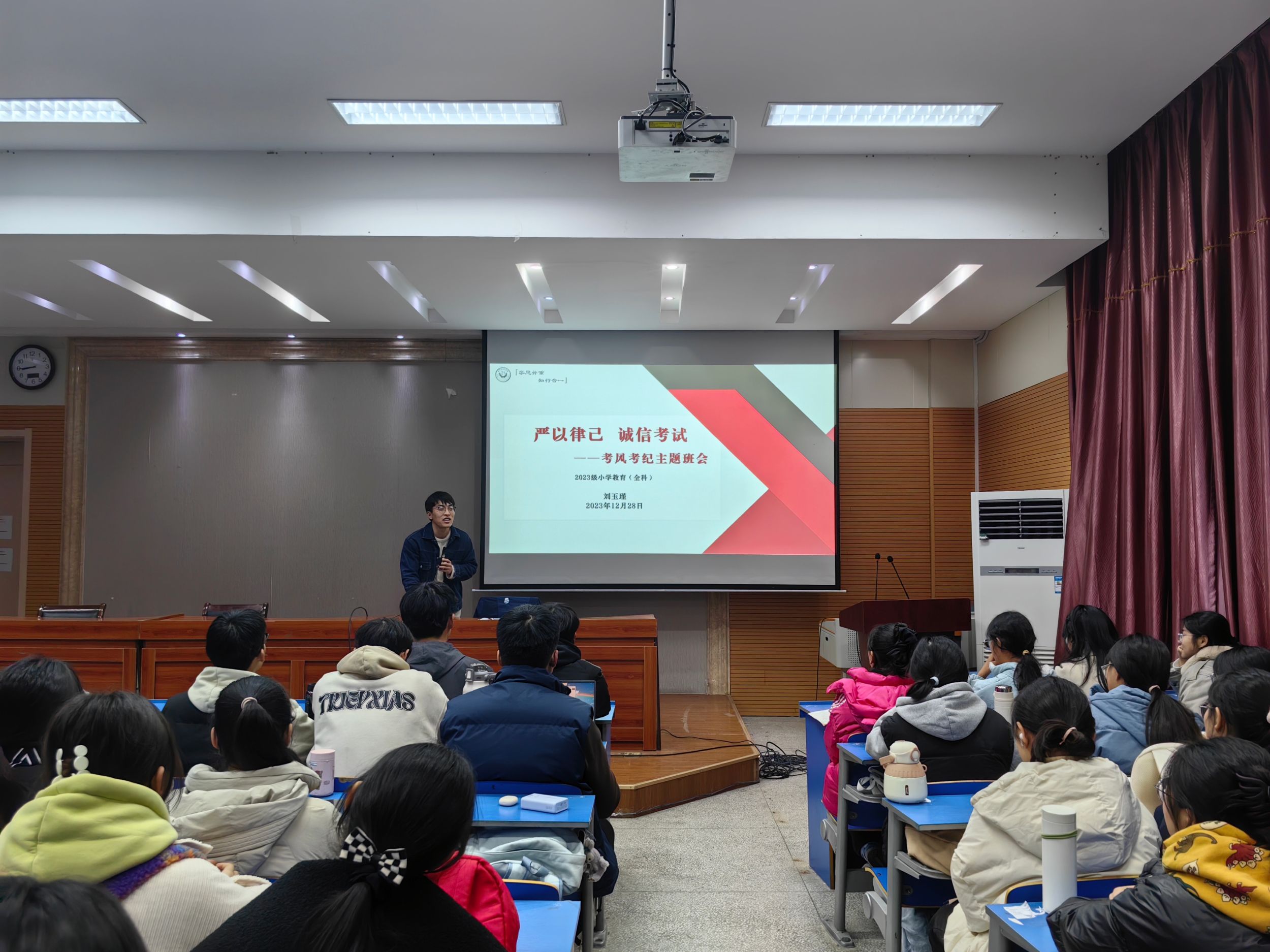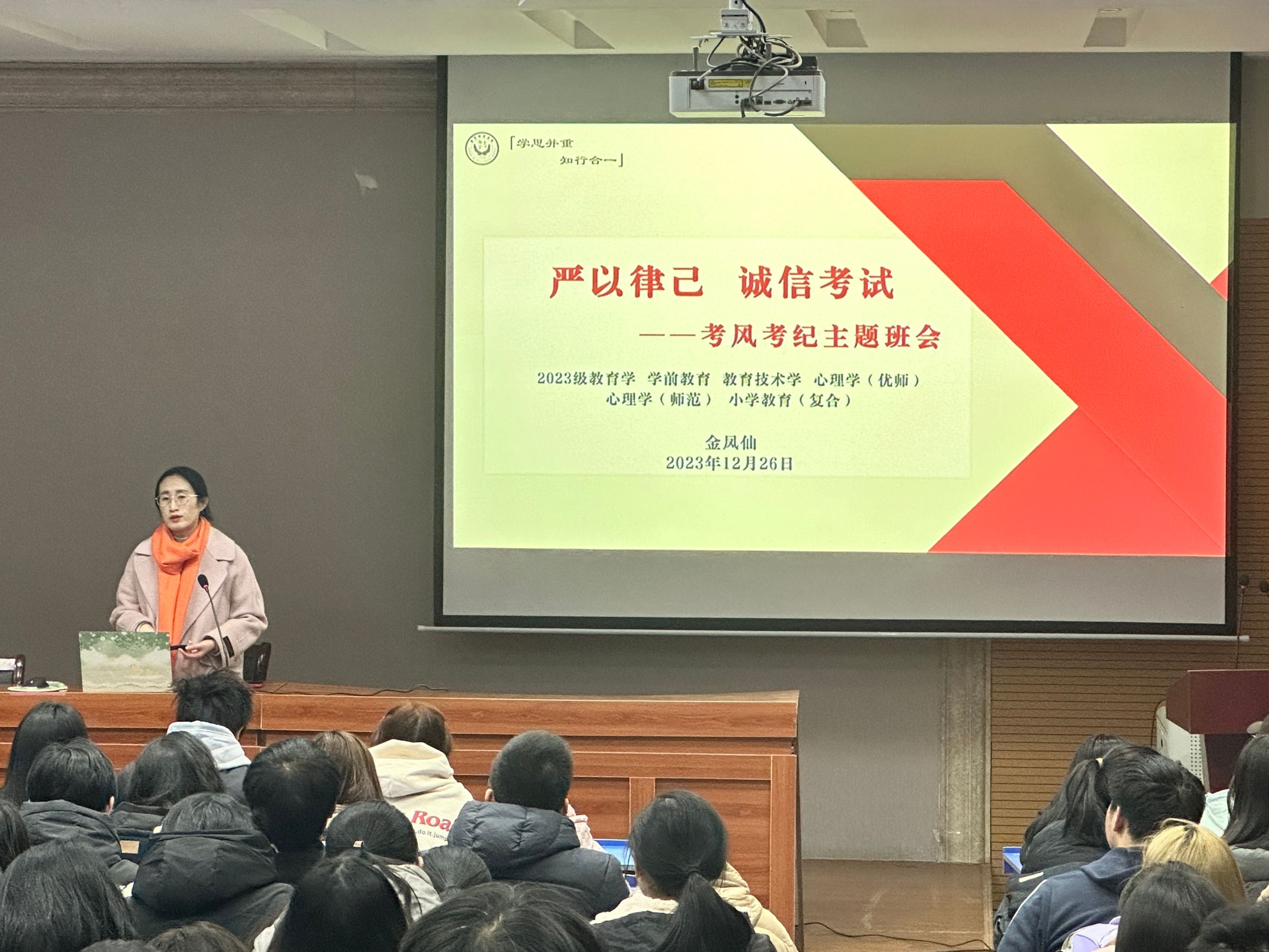 为规范期末考试纪律,严明考风考纪,12月26日和28日学院在天门山校区图书馆报告厅召开23级本科生“严以律己,诚信考试”考风考纪主题班会,23级本科生辅导员金凤仙、刘玉瑾主持,23级全体本科生参与。