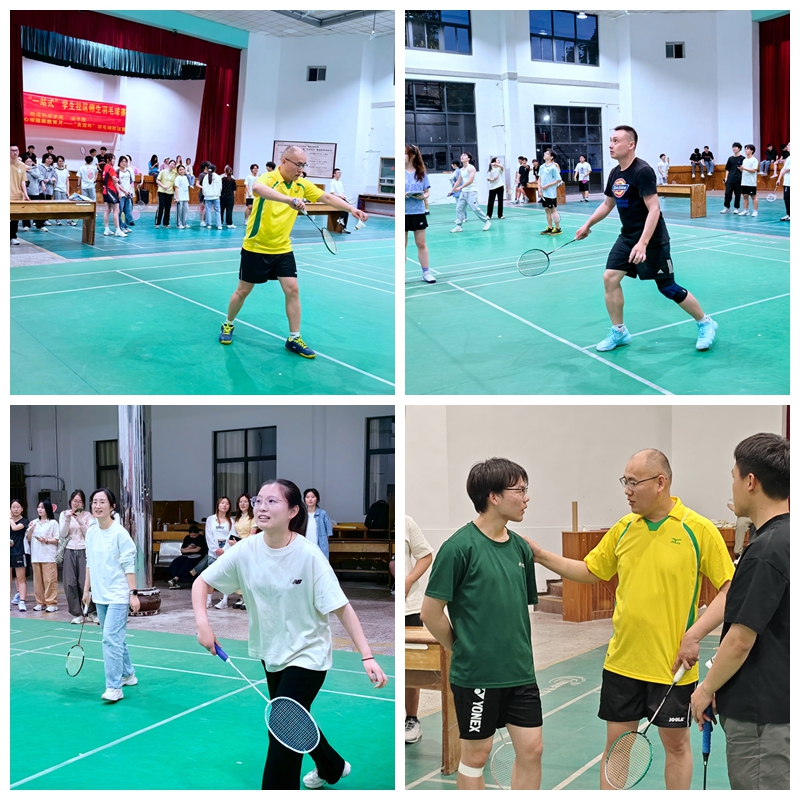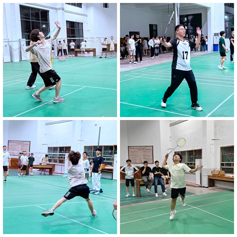 本次比赛共分为小组预赛决赛两个阶段,采用混合团体赛制,参赛双方按照男单、男双、女单、女双的比赛顺序展开竞赛,采用21进球制,遵循公平竞争、友谊第一、比赛第二的原则。高远球、扣杀、劈杀、轻吊、平抽、快打……比赛场上热火朝天,老师和同学们纷纷展现出了不同的击球方式。赛场内的选手们挥洒汗水,展现球技,赛场外的观众热情高涨,为选手呐喊助威,整个运动场呈现热火朝天的景象。