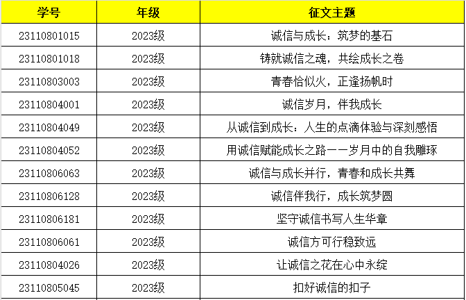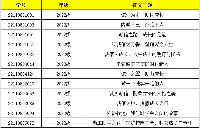 诚信树人,于作品创作下见成长。通过诚信主题作品创作,让学生的诚信理念内化于心、外化于行。学院鼓励各年级学生采用文稿、书法等丰富形式开展诚信主题作品创作,引导学生践行“讲仁爱、重民本、守诚信”的价值理念。面向家庭经济困难学生群体举办“诚信˙成长”主题征文活动,累计收集征文作品276份,进一步推动学院资助工作实现“扶智”与“扶志”的有机结合,助力贫困学子努力奋进、恪守诚信、心怀感恩。