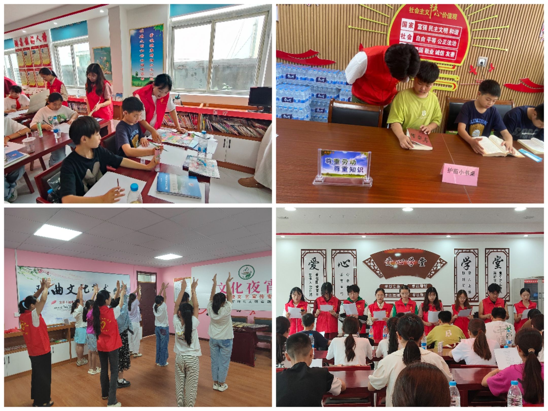 为进一步深化实践活动的社会影响力,与当地文化站联合开展志愿服务。结合当地文化站五大特色品牌“传化讲堂”“爱心学堂”“文化夜宵”“纳凉书场”“流动书籍”开展此次的志愿活动。志愿者根据自身专业特点开展“爱心课堂,护苗成长”,为社区儿童提供音乐、舞蹈、阅读等多项聚焦于青少年的针对性课程。