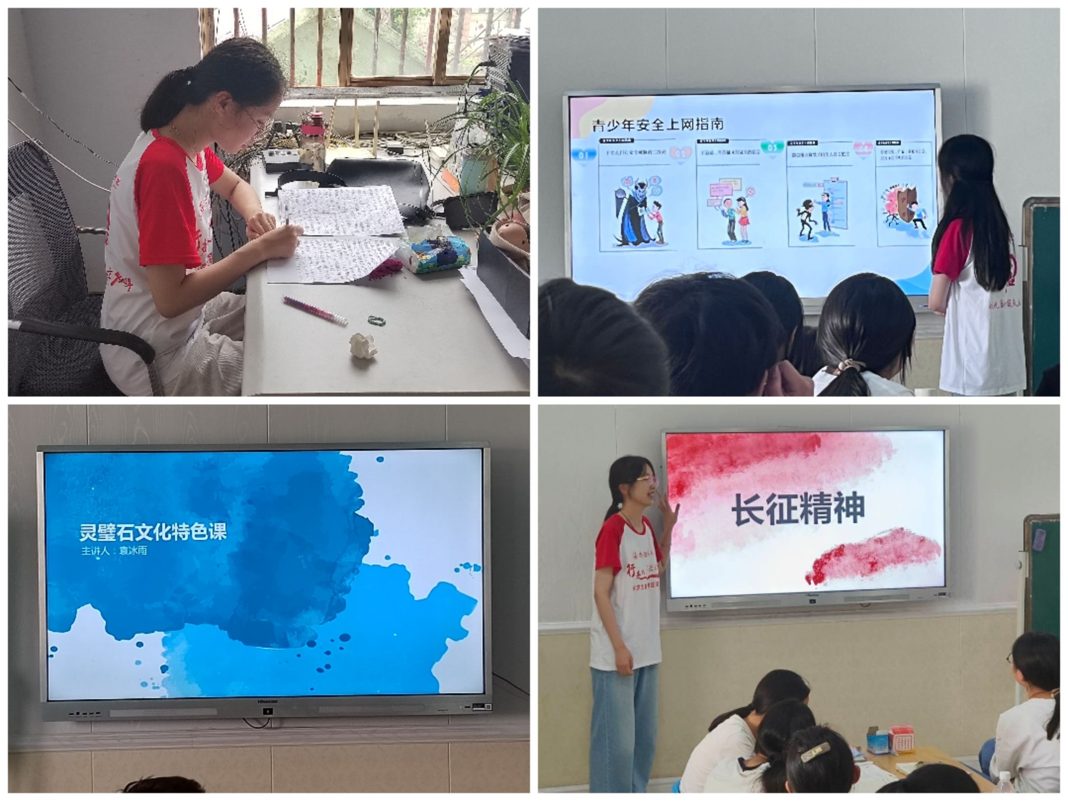 为确保志愿者顺利适应教学环境以及深入了解不同年级差异性,志愿者被分到不同年级观察分析记录,利用课下时间进行探讨总结,并对课程内容做出针对性的调整。为帮助孩子们更快融入集体,第一节课主题确立范围广泛概念具体明确的安全教育,并根据时代科技发展和学生心理发展着重提出网络安全和校园霸凌安全教育;为拉近与学生间的距离,传统文化首要选择为“灵璧石文化”,并通过实物进行同步讲解。志愿者们利用多媒体教学工具,结合生动有趣的互动游戏,让课堂充满了欢声笑语。