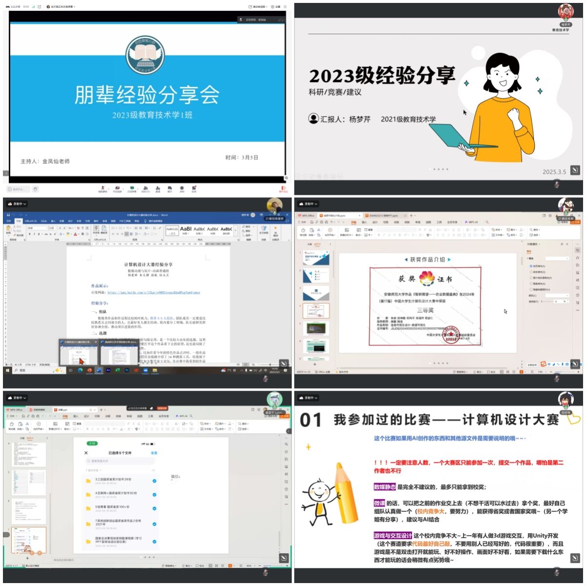 为激发学生创新思维,提升学生专业胜任力,3月5日下午,2023级本科生开展竞赛主题朋辈线上分享交流会。交流会由教育技术学专业班长徐天琪主持,邀请了杨梦芹、杨爱娇、刘坊琳、朱政、盛玺宁等5位高年级竞赛优秀获得者展开线上分享交流,2023级本科生专职辅导员金凤仙以及全体2023级教育技术学专业及其他2023级专业学生共计70余名学生参与。