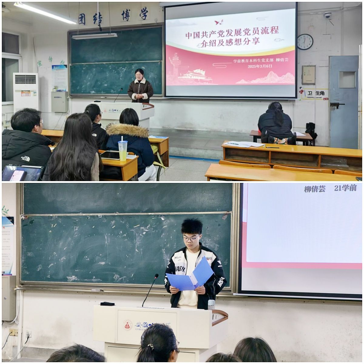 为加强入党积极分子的培养和教育,确保党员发展质量,推进榜样示范与引领,3月6日晚,学院在田楼8101召开2023级本科生“坚定入党初心”主题班会,班会由2023级专职辅导员金凤仙主持,班会还邀请了学前教育本科生党支部委员柳倩芸与心理学本科生党支部委员谢家磊分享交流,2023级全体入党积极分子与部分团员共计70余人参加。