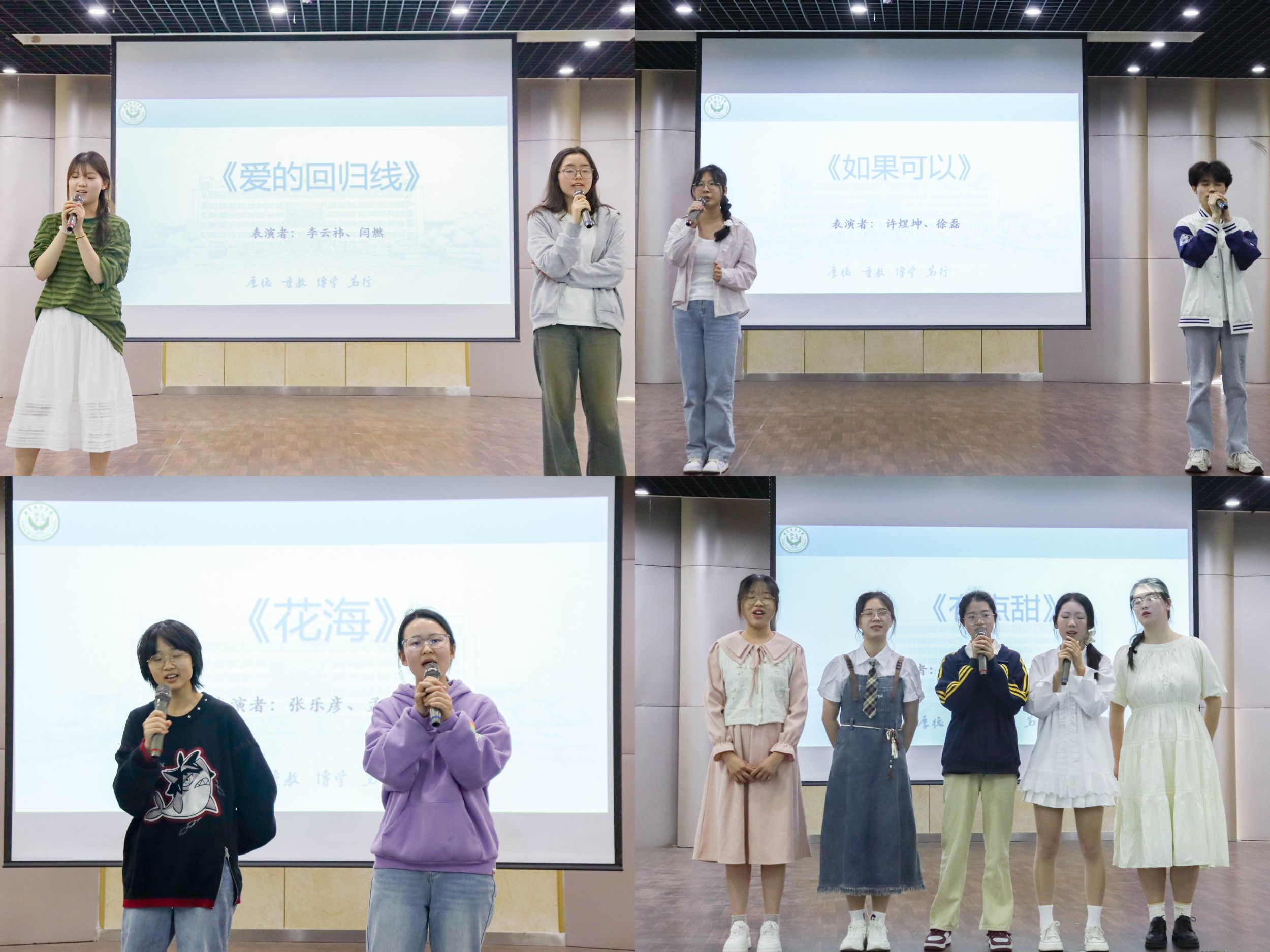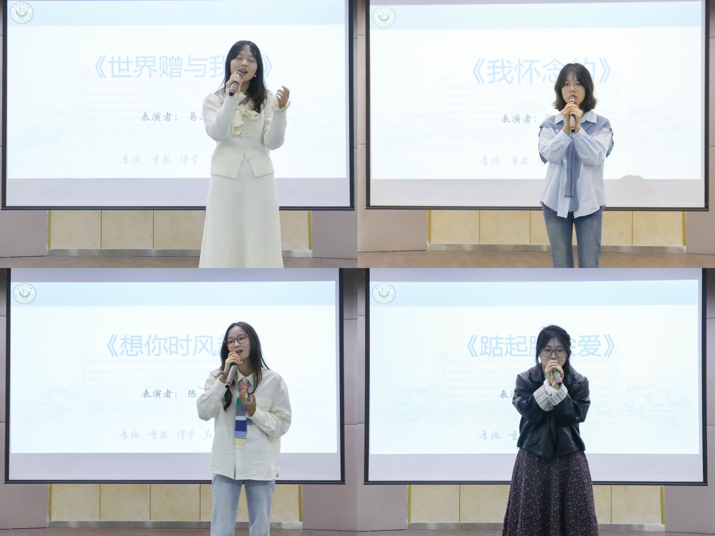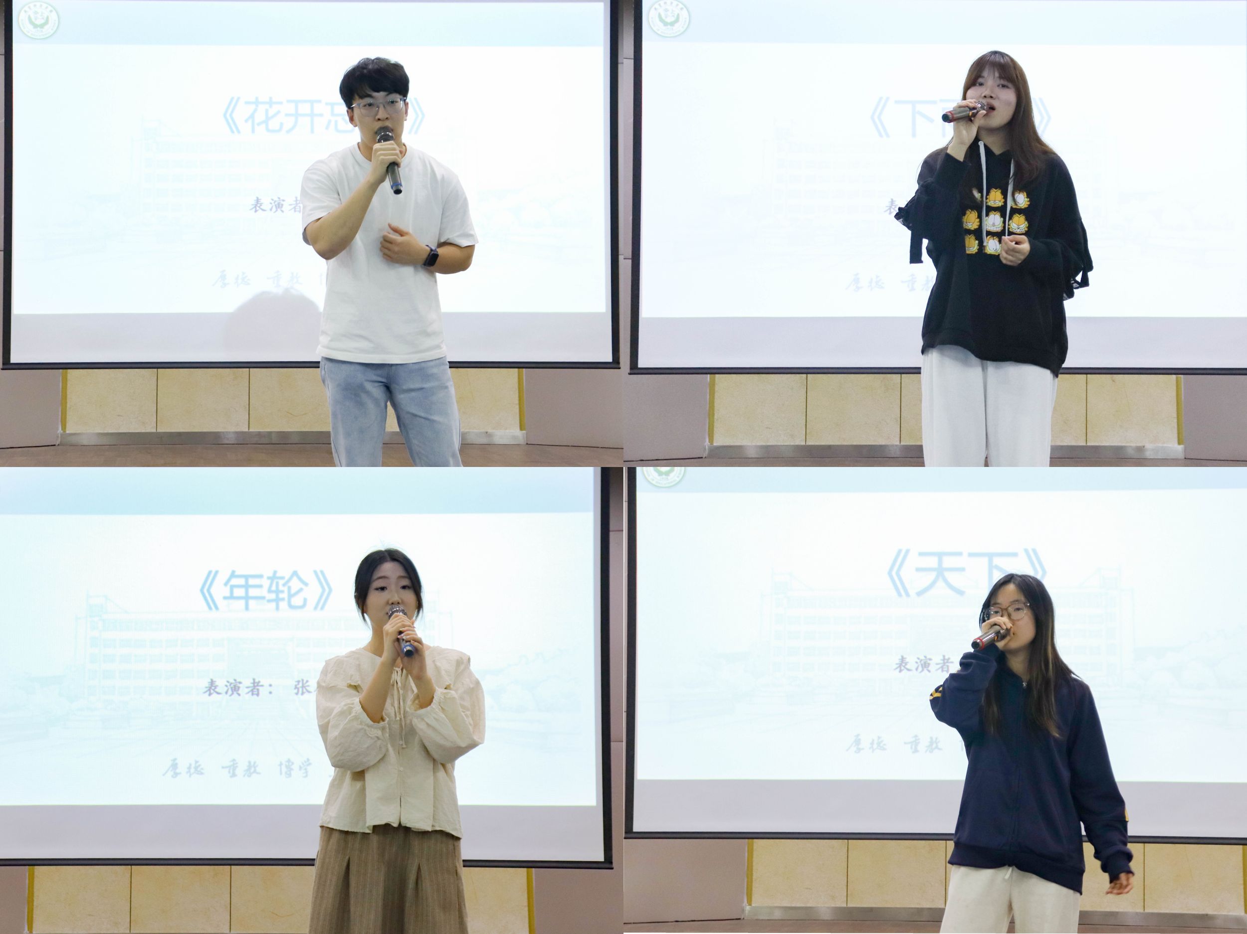 奏响旋律,歌声回荡。选手依次上台一展歌喉,为在场的评委老师和观众们带来了一场音乐盛宴。温馨而充满希望的《花开忘忧》慢慢拉开比赛的帷幕,悠扬深情的《年轮》和《空白格》紧随其后,《花海》的轻快愉悦与《天下》的磅礴豪迈又形成对比,《世界赠予我的》带着感恩与温暖的美好将比赛推向高潮,让人沉浸其中,深深动容。
