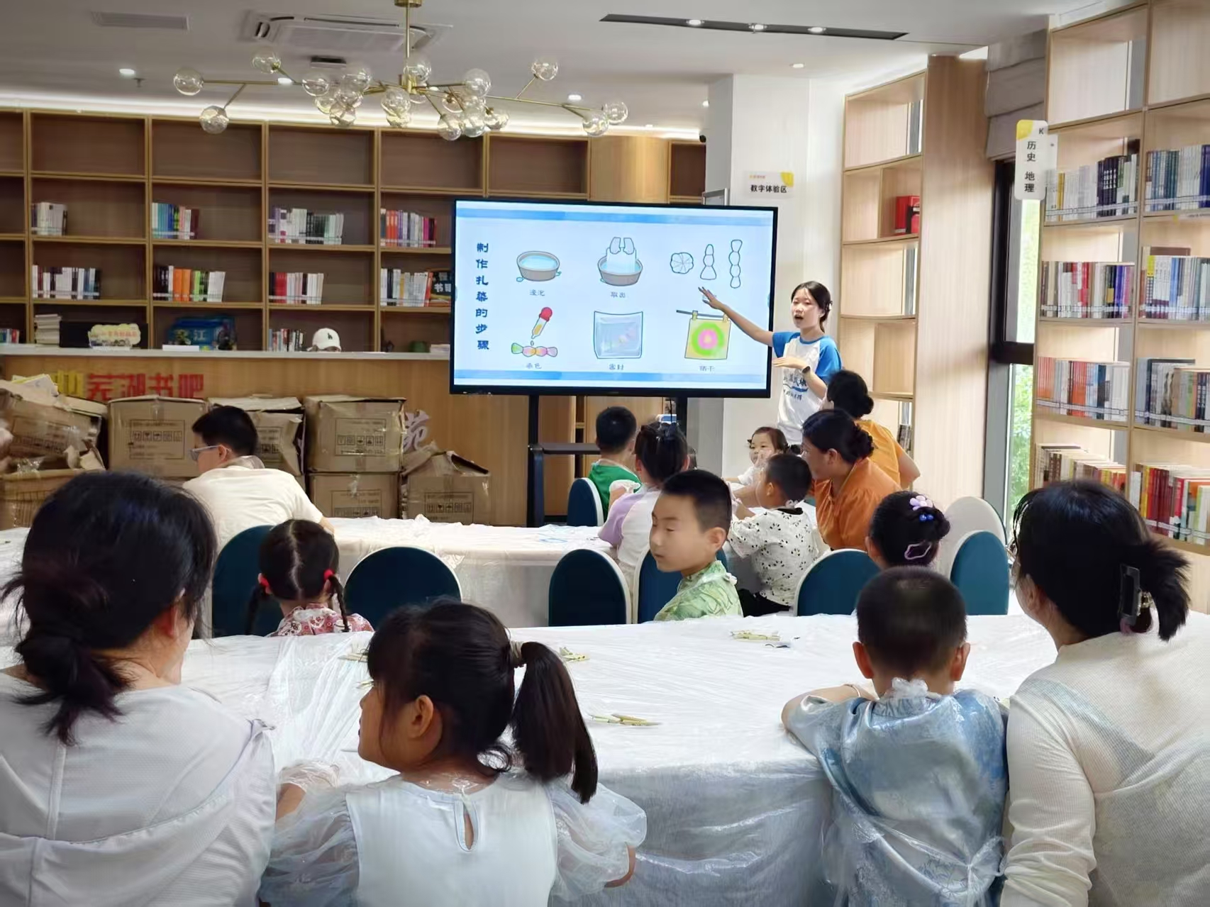 理论讲解之后,在团队成员的指导下,孩子们纷纷动手尝试,挑选自己喜欢的布料,设计独一无二的图案,用绳子、皮筋等工具 小心翼翼地进行捆绑扎结。随后,他们亲手将布料浸入染料中,看着色彩在布料上慢慢渗透、扩散,形成一幅幅独一无二的艺术作品,孩子们的脸上洋溢着满足与自豪的笑容。