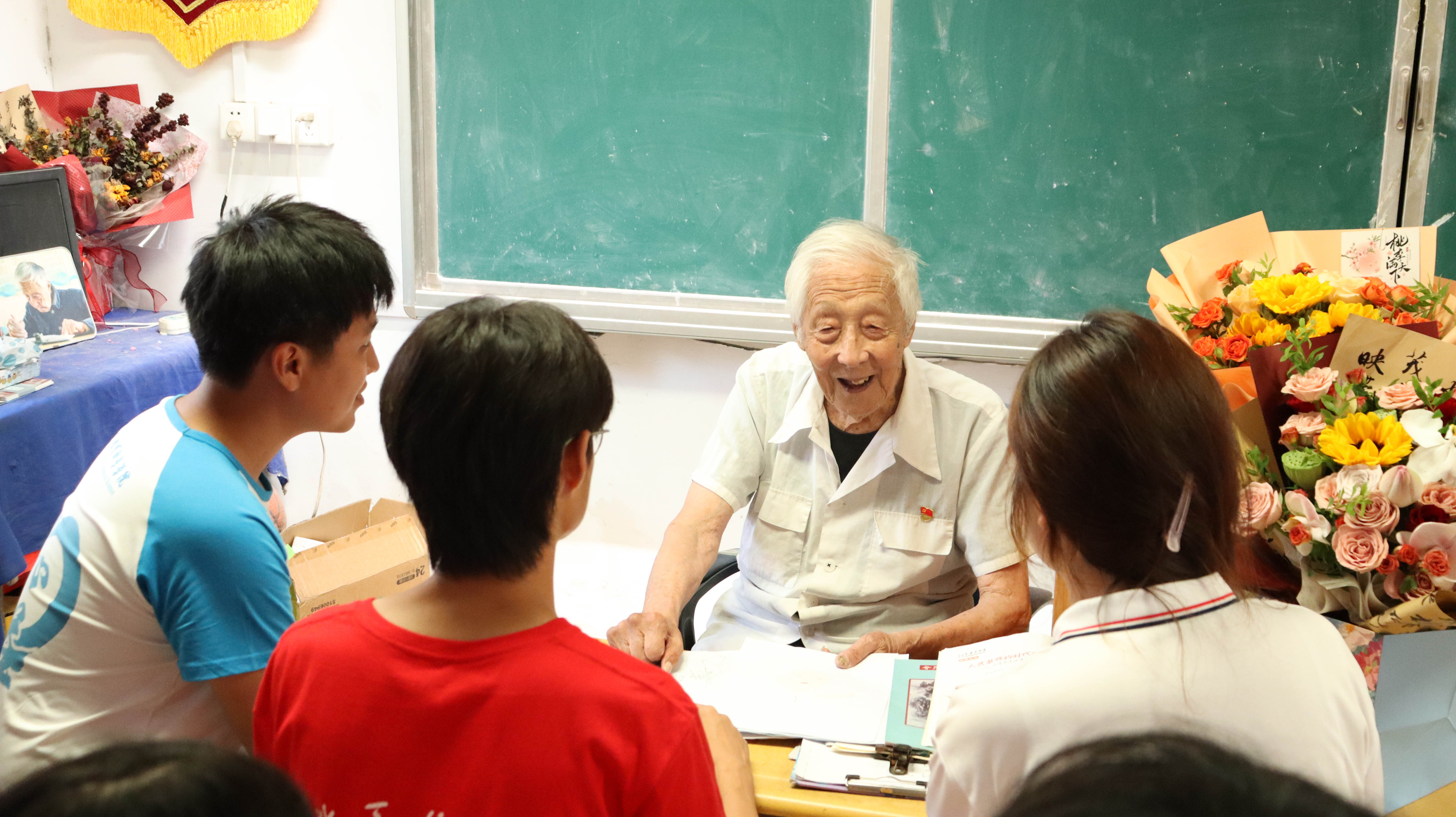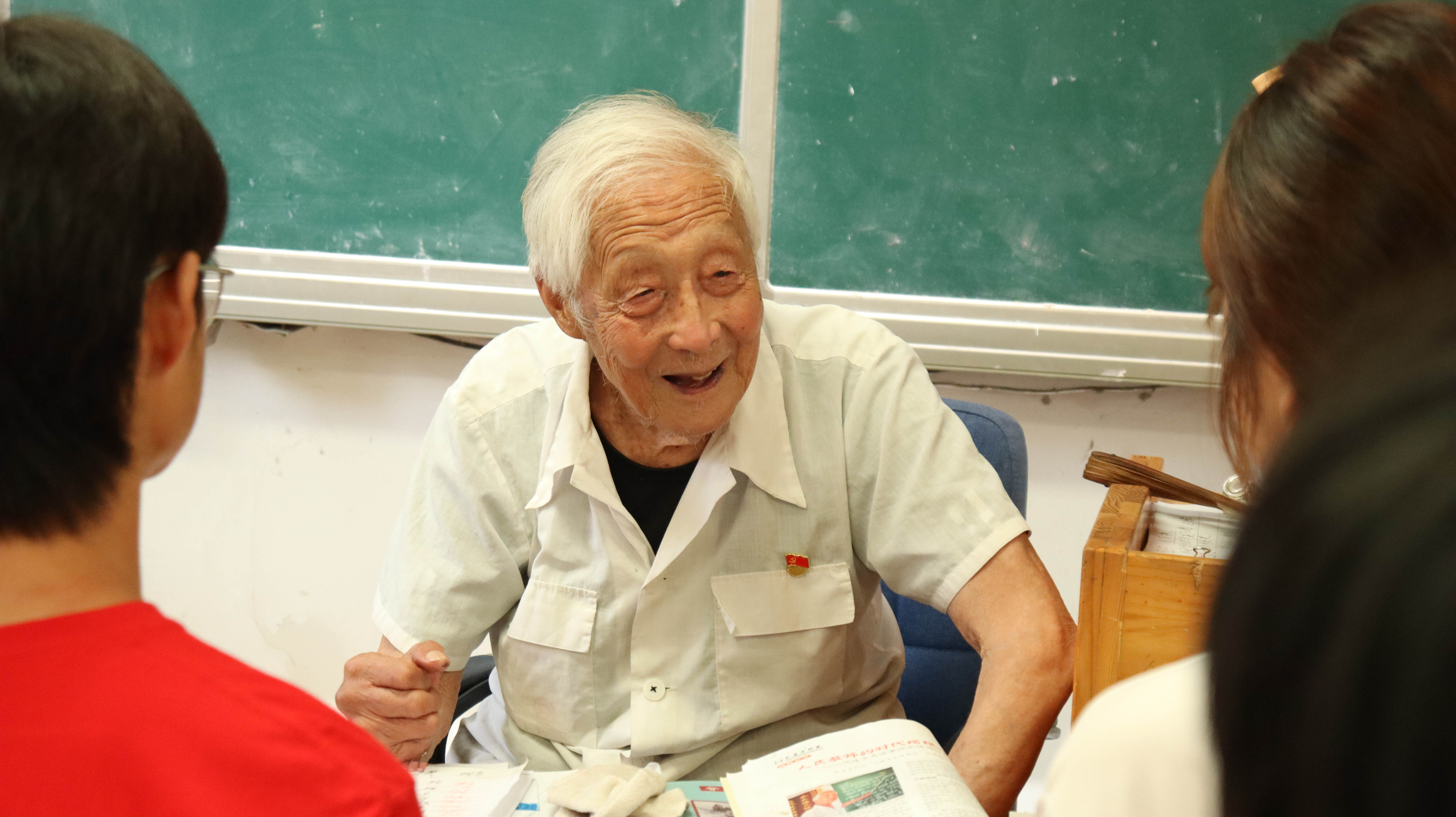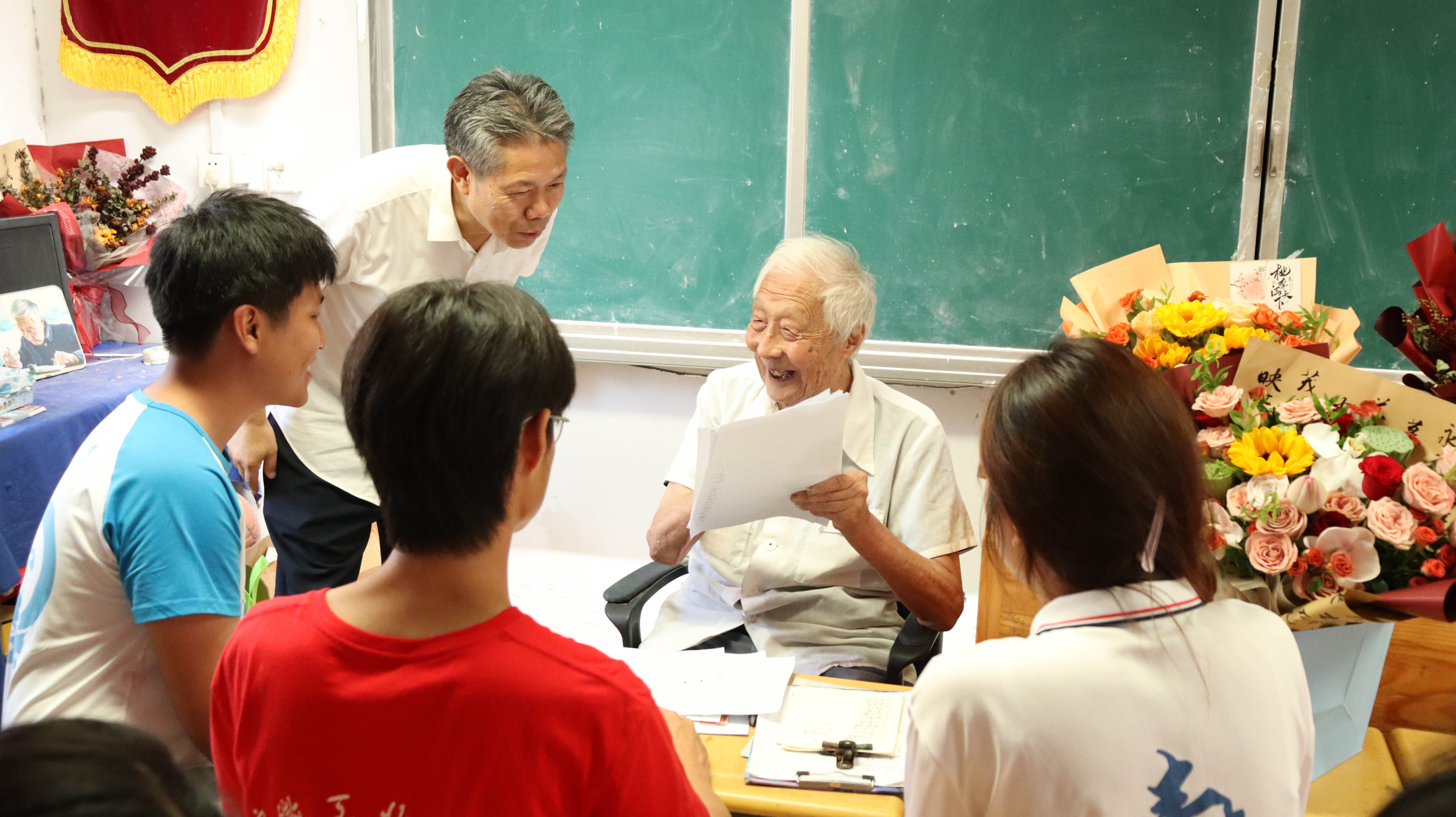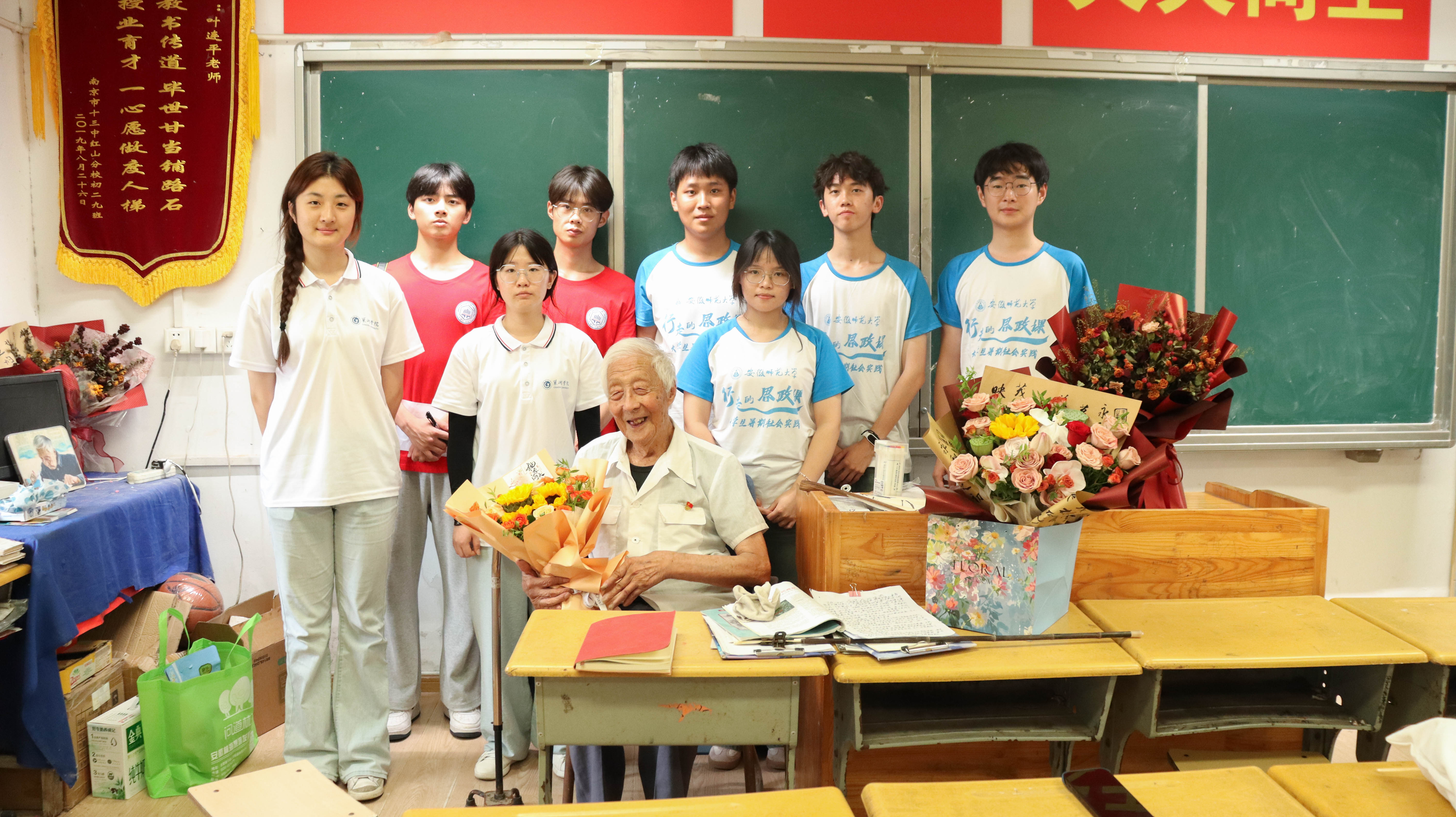 7月9日下午,365英国上市官网师生一行,怀着崇敬之心步入和县乌江镇卜陈村叶连平老先生的“留守未成年人之家”。这位九十八岁高龄的老教师,此刻正佝偻着身躯在黑板前批改作业,粉笔灰细密地落满他旧中山装的袖口——这幅宁静画面,无声诉说着一位乡村教育者生命深处的执着。