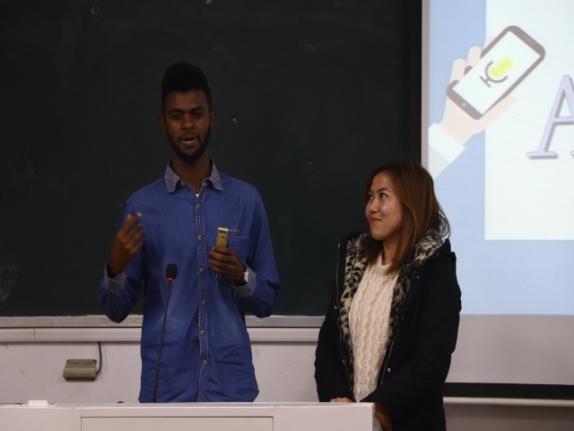 本次决赛分为英语主题演讲、现场提问、才艺展示三个环节。首先,选手们围绕“我与师大初相识”做主题演讲。为了更好地增强演讲效果,每位选手认真准备了电子版演讲稿以及相应PPT。比赛中每三位选手分为一组,分别进行演讲并回答评委的提问。参赛选手个个精神饱满,语言流畅,并合理运用肢体语言,适时进行目光交流,充分展现了自己在英语学习上的深厚基础和较强的语言应用能力。在提问环节中,选手们更是表现不俗,对评委的问题应对自如。为了调节比赛节奏,并适度缓解选手比赛时的紧张情绪,在每组演讲之后都会进入轻松的游戏时间。在座观众积极参与,现场气氛轻松活跃。才艺表演环节节目形式多样,有生动的美文朗诵、动听的英文歌曲、惟妙惟肖的创意配音等,赢得了观众的阵阵掌声。比赛临近尾声,由留学生林家兴、刘海、娄娜代表发言,由院学生会主席王晨旭进行总结。