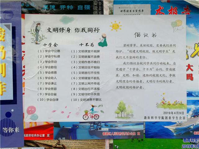 为了进一步扩大文明建设的广度,我院在QQ、微信、微博等新媒体平台推送有关“文明自身、净化校园”的宣传通告,倡导学生们自我管理,相互监督,做文明学子,建文明校园。在学院和校园的宣传栏上,我院制作了崭新的文明修身宣传展板,以学生喜闻乐见的形式对来往行人进行提醒和要求。我院旨在开展“浸润式”的宣传教育,润物无声的深化学生的文明意识。