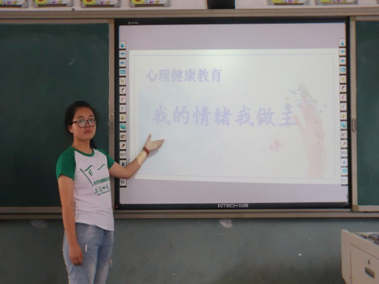 应当地教育部门要求,考虑到当地小学生大多数为留守儿童,针对这一现状,我们开展了以“我的情绪我做主”为主题的心理健康课程,以“少一些烦恼,多一些快乐”为宗旨,目的是教会学生如何疏导情绪,控制情绪。在与学生交流过程中,心理老师了解到大部分学生的烦恼为因长期与父母分隔两地而无法相见。基于此种情况老师在课堂上提出多种控制情绪的方法来缓解不良情绪,如自我暗示法和注意转移法等。孩子们积极配合,在老师的帮助下逐渐打开心结,敞开了心扉。