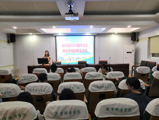 (本网讯 教科院 陈文霞 艾瑞雪)为使毕业生进一步了解就业信息,提供更多的就业机会,学生实习刚刚结束,11月1日下午学院在313学术交流中心开展学前教育专业专场招聘宣讲会。教科院党委副书记张如华出席了宣讲会并鼓励同学们抓住机会,找到理想的工作岗位。本次宣讲会主要有芜湖暖心小镇儿童康复训练中心、杭州龙井幼儿园、苏州尔家幼教集团三家招聘单位,会议由2016级辅导员艾瑞雪主持,学前教育专业毕业生及其他感兴趣的同学参加了本次宣讲会。