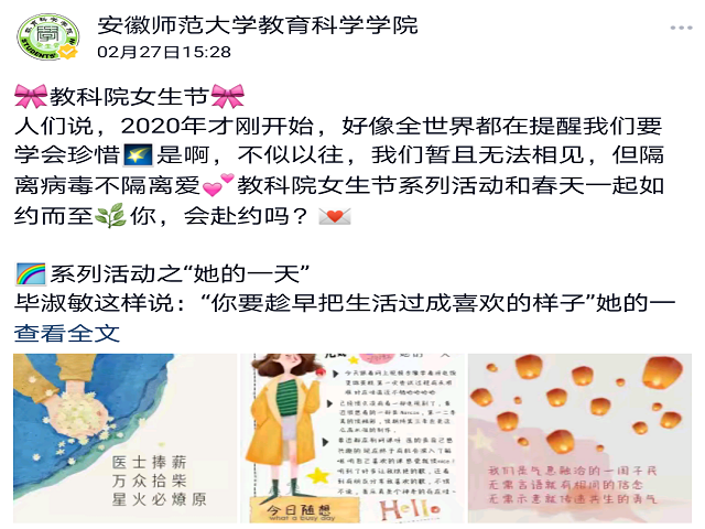本网讯(教科院 张天乐)疫情前线不断传来白衣天使的感人事迹,为赞美女性、致敬坚守在一线岗位的白衣天使和表达对家中亲人的情感,我院在2月28日举行了“她的一天”和“细语告白”线上系列活动,由我院团委副书记程啸老师及团委学生会主席团成员构成评委组进行评分。