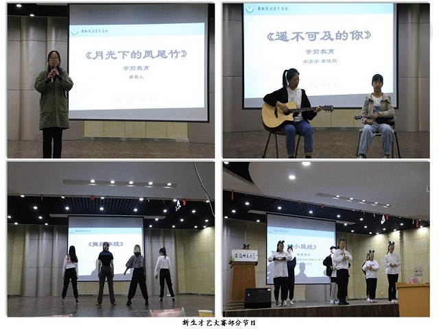 激情碰撞,风华尽展。精彩绝伦的舞蹈,幽默诙谐的相声,风格各异的乐曲,生动感人的表演,参赛选手饱含激情,各施所长,现场氛围轻松活跃,欢声雷动。《江南》伴随着淡淡忧愁,在听者心中留下了岁月的痕迹;《浮夸》振奋的高音使得全场的热度达到了沸点;古筝《大鱼》以悠悠琴声将观众带入了梦境;舞蹈《小跳蛙》以欢快节奏引发同学们拍手应和……除了各式各样的歌舞,语言类节目亦精彩纷呈。相声《德云小社》笑点连连,激起观众互动热情,弘扬着优秀的国学文化;话剧《平凡之辈》演绎抗疫故事,超凡的演技深入人心,带给同学们感动与思考;诗朗诵《四月的纪念》抒发了对美好青春的憧憬,激起观众心中对美好情谊的向往。一句句的歌声嘹亮、一幕幕的舞姿翩翩、一阵阵的笑声朗朗中,新生才艺大赛的进度条慢慢拉满。