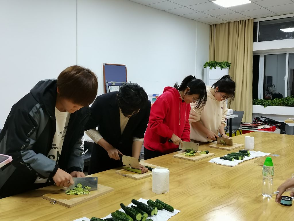 本次厨艺大赛分为初赛与决赛两轮,共有四十名同学报名参加。初赛于11月13日晚在田楼B座二楼F207室举行,工作人员为参赛同学们提供了黄瓜与工具,考验同学们的刀工。在手起刀落中,同学们展现了自己的技术与自信。经过评委们的细心观察与留意,最终选出十位同学进入决赛。