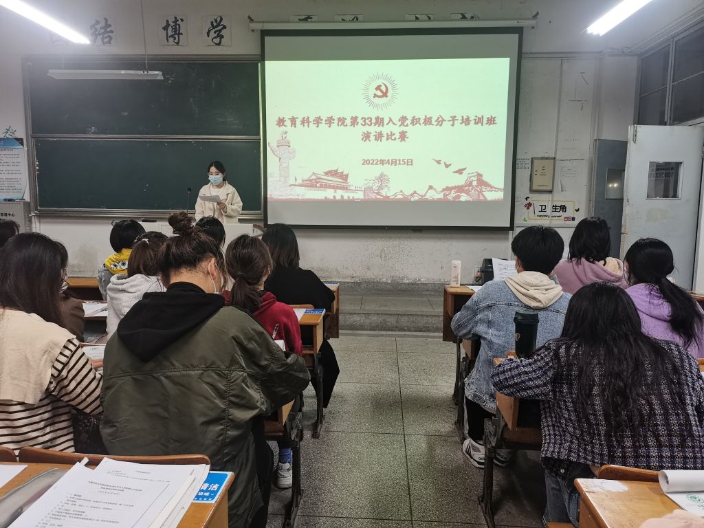 为推进党史教育,加强同学们的党性修养,4月15日晚,教科院第33期入党积极分子培训班成员于田楼8101教室开展“学党史 树新风”主题演讲比赛。培训班四个小组共推出八位同学参加决赛,同学们都饱含热情,积极参与到本次演讲比赛中,在学员的演讲中深入了解中国共产党的百年历史,也让大家更加坚定了自己想要成为一名共产党员的决心。