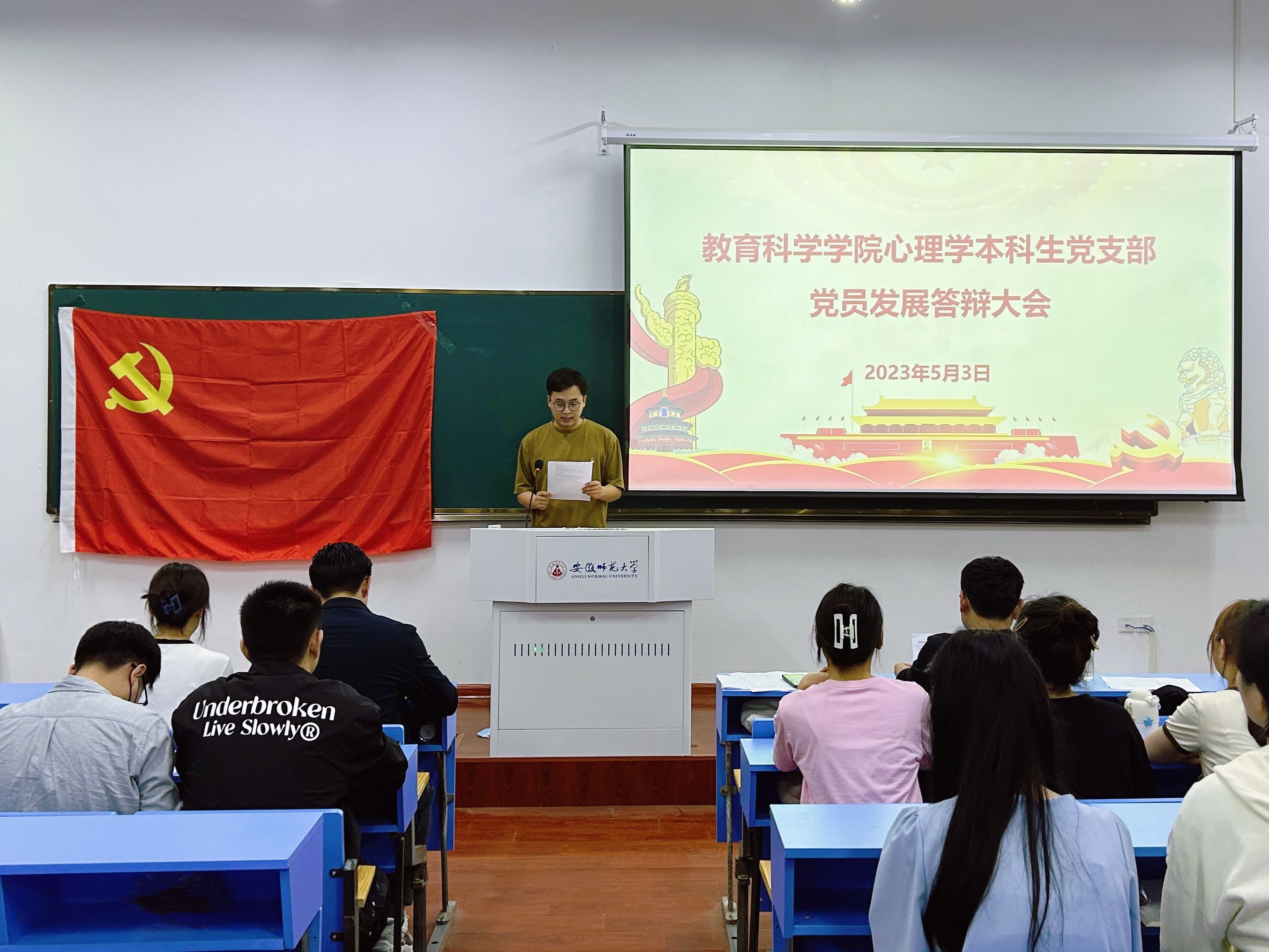 为确保党员发展质量,考察拟发展对象的理论素养和综合素质,2023年5月3日晚,365英国上市官网心理学本科生党支部于教学楼1108教室召开了2023年上半年党员发展答辩大会。365英国上市官网副院长韩建涛、心理学本科生党支部书记张理强、支部组织委员程啸,以及2019级辅导员濮楠楠组成答辩委员会,支部全体学生党员、入党积极分子参与了现场评议工作。
