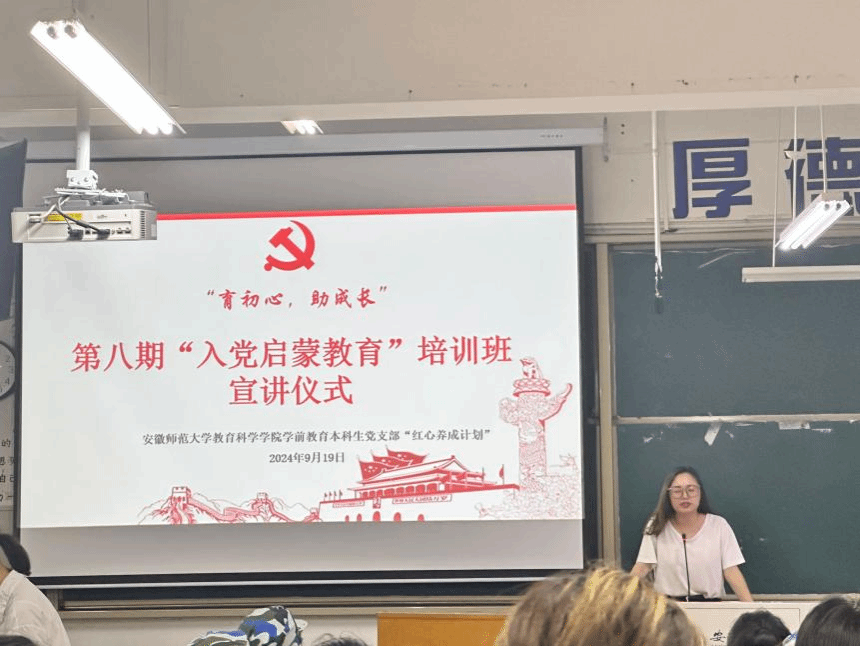 为启蒙2024级学前教育新生入党意识,激发广大新生的入党热情,9月19日晚,教科院第八期“入党启蒙教育”培训班宣讲活动于田楼8202和8210教室顺利举行。本次活动由2023级入党积极分子李韵馨主持,学前教育专业本科生党支部书记蔡文、“驻班党员”、“先锋导员”及2024级学前教育、学前教育(中外合作)专业全体新生参与活动。