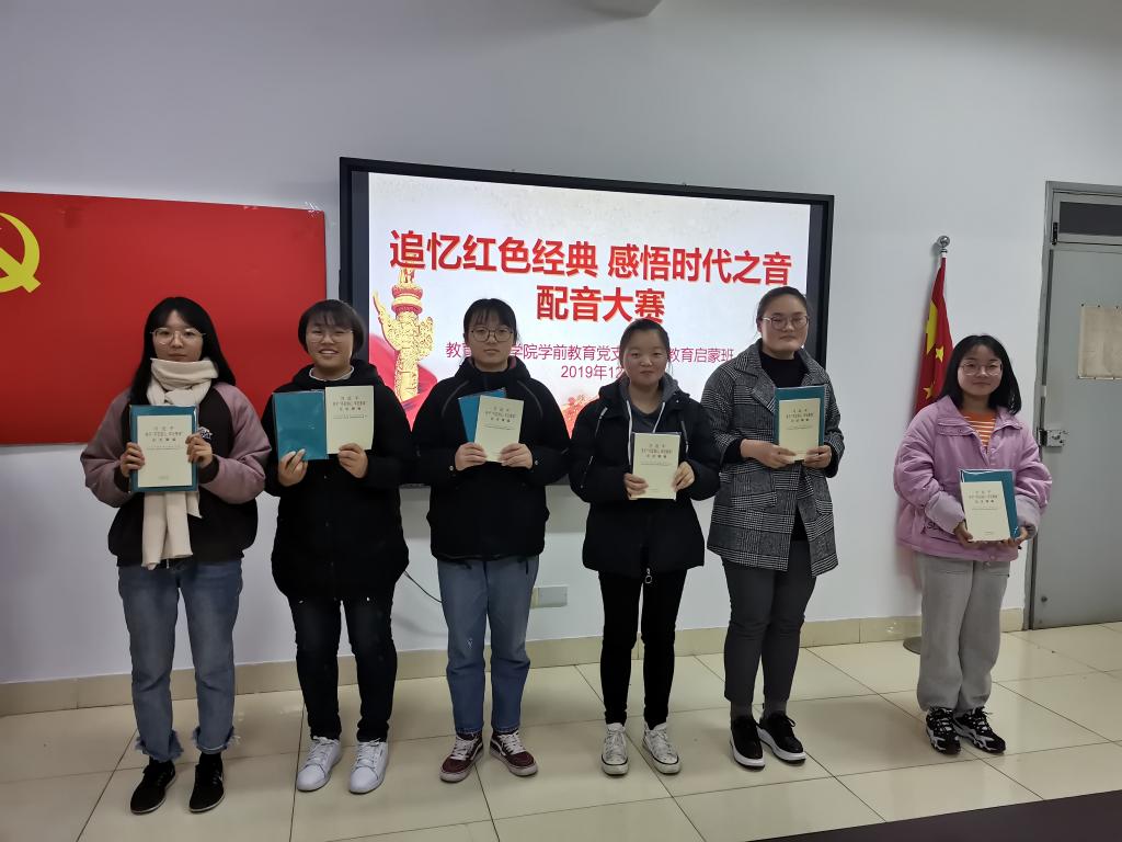本网讯(教科院 詹洁)12月5日晚19:00,入党启蒙培训班在院308会议室举行了“追忆红色经典 感悟时代之音”为主题的配音大赛, 学前教育本科生党支部书记龚伟,2019级辅导员莫大贡、2017级辅导员以及教育技术学张帅老师担任评委,2019级启蒙班全体成员参加了此次活动。