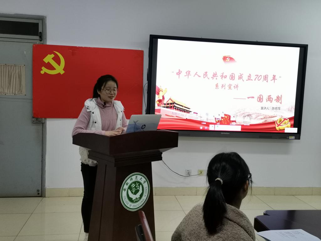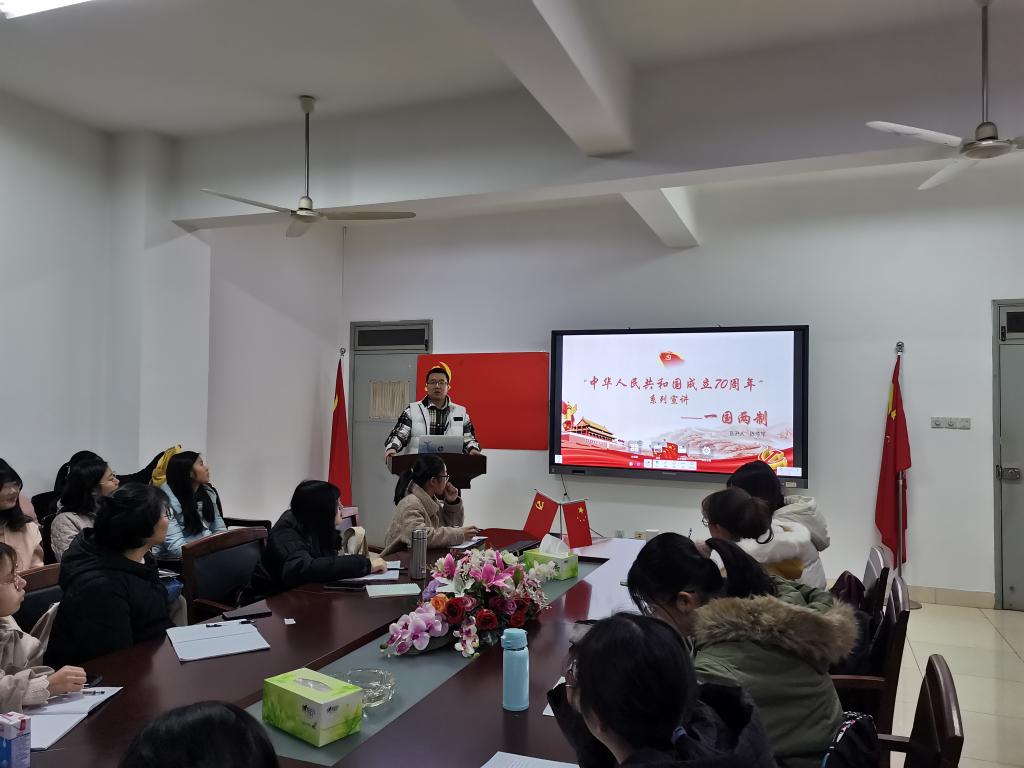 在此次活动之前,2017级学前教育本科生党支部陈燕萍同学以“一国两制”为主题为大家带来了“青春中国”理论宣讲第四讲,并从基本内涵、伟大意义和伟大实践带领成员们回顾了港澳回归的历程,引导同学们立志成长为有理想、有道德、有文化、有纪律的新时代青年。