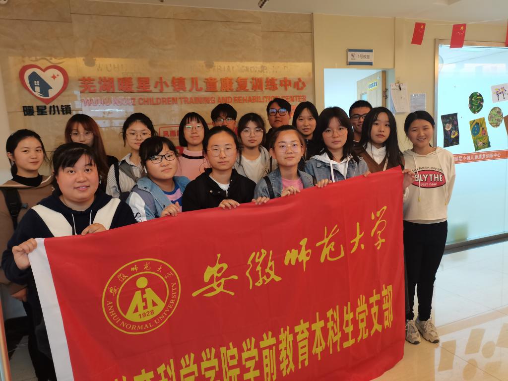 本网讯(教科院 张能瑞 张紫健)为了践行社会主义核心价值观,提升新一代青年的思想水平,传播志愿服务精神。学前教育本科生党支部第四期“入党启蒙教育”培训班15名同学和2名驻班党员、3名先锋导员于今年10月初共同组成了启蒙班赴暖星小镇支援服务团队,到目前为止,团队已四次前往芜湖暖星小镇儿童康复训练中心(以下简称暖星小镇)开展了志愿服务。