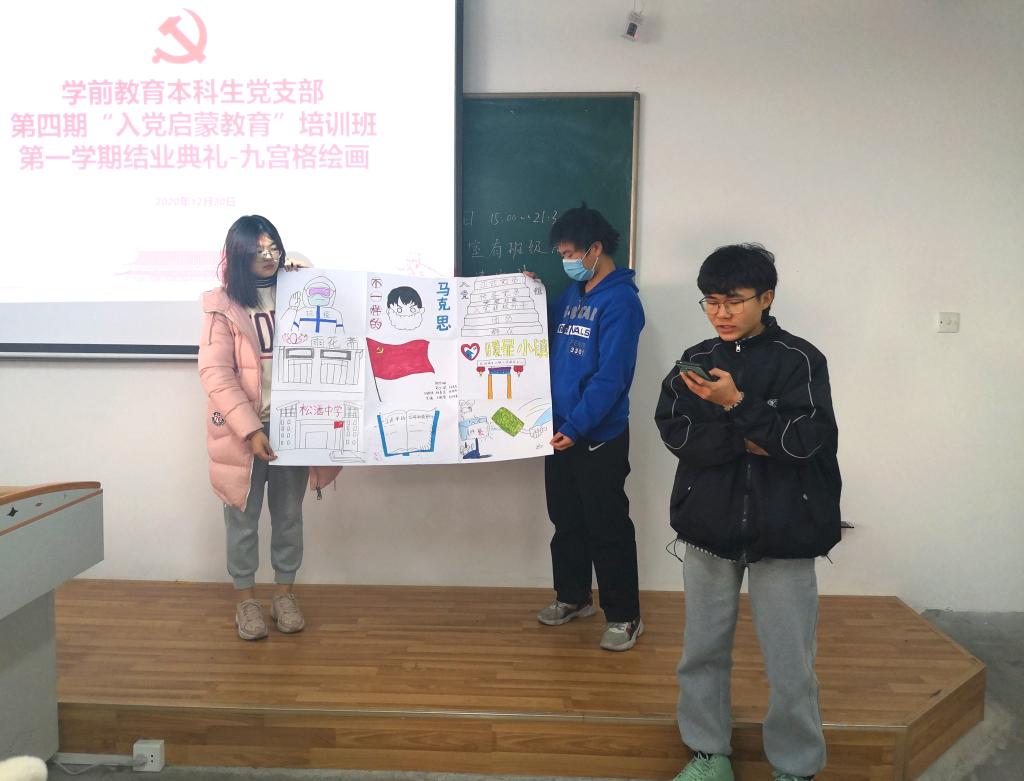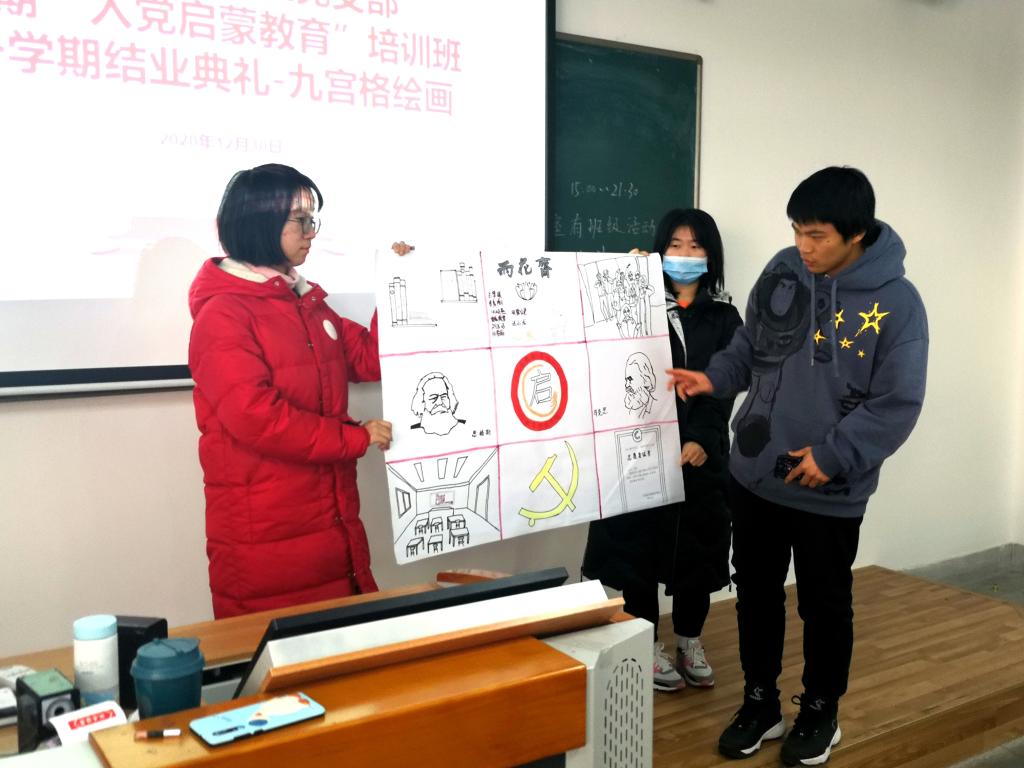 首先,龚伟老师简要介绍了本次活动的目的并宣布汇报开始。随后,启蒙班6个小组成员依次展示并介绍了组员合作完成的九宫格绘画作品,“最熟悉的陌生人——马克思”“暖星小镇”“雨花之行”等内容展现本学期参与的理论学习与实践活动,党徽党旗展现了学员们爱党、爱组织,一心一意跟党走的决心。
