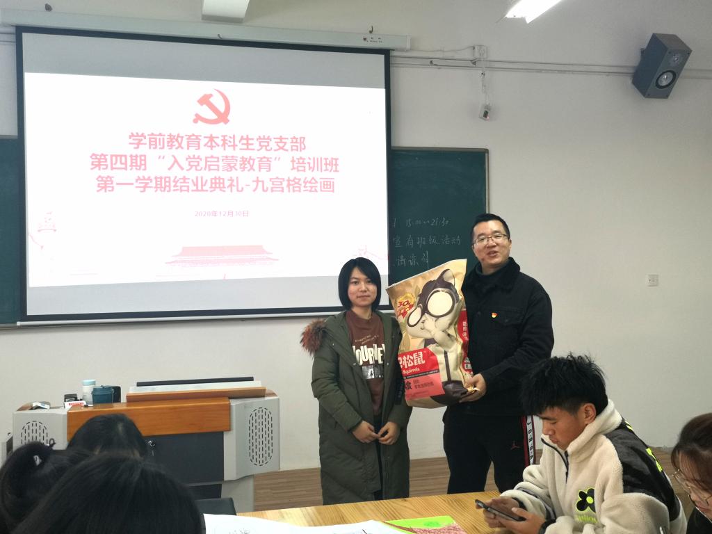 随后,学员们对各小组汇报结果进行投票并角逐出优秀小组,龚伟老师为该小组发放奖品。活动最后,17级驻班党员宛亚静同学就本学期启蒙班的各项活动进行了总结,并为下学期活动进行了简单介绍。