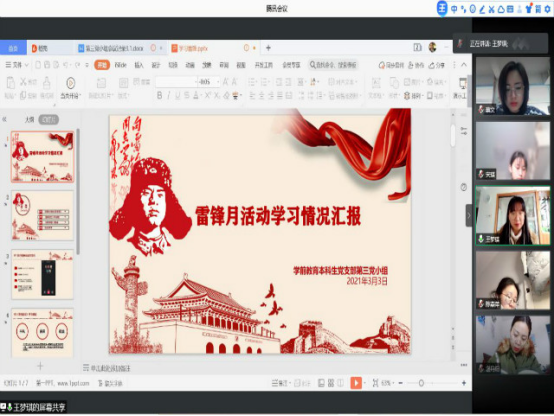 《雷锋日记》不仅展现出雷锋同志无法掩盖的青春激情,更是承载了对青年朋友们的教育与鼓励。为直观了解雷锋的一生,深刻感悟雷锋精神,学前教育本科生党支部全体成员进行雷锋日记的阅读学习以及交流讨论。于3月3日下午,通过线上PPT汇报的形式,各组代表阐述了小组成员学习与讨论雷锋日记的成果。