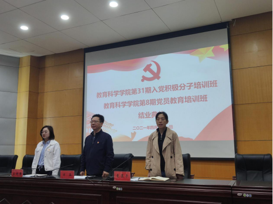 结业典礼在庄严的国歌声中拉开序幕,副班主任蔡文介绍了本次结业典礼的议程,入党积极分子培训班班长2018级学前教育专业戴国强同学和党员培训班宣传委员2019级现代教育技术学中美专业研究生段悦鑫同学分别总结了本期培训班的教学与实践开展情况。